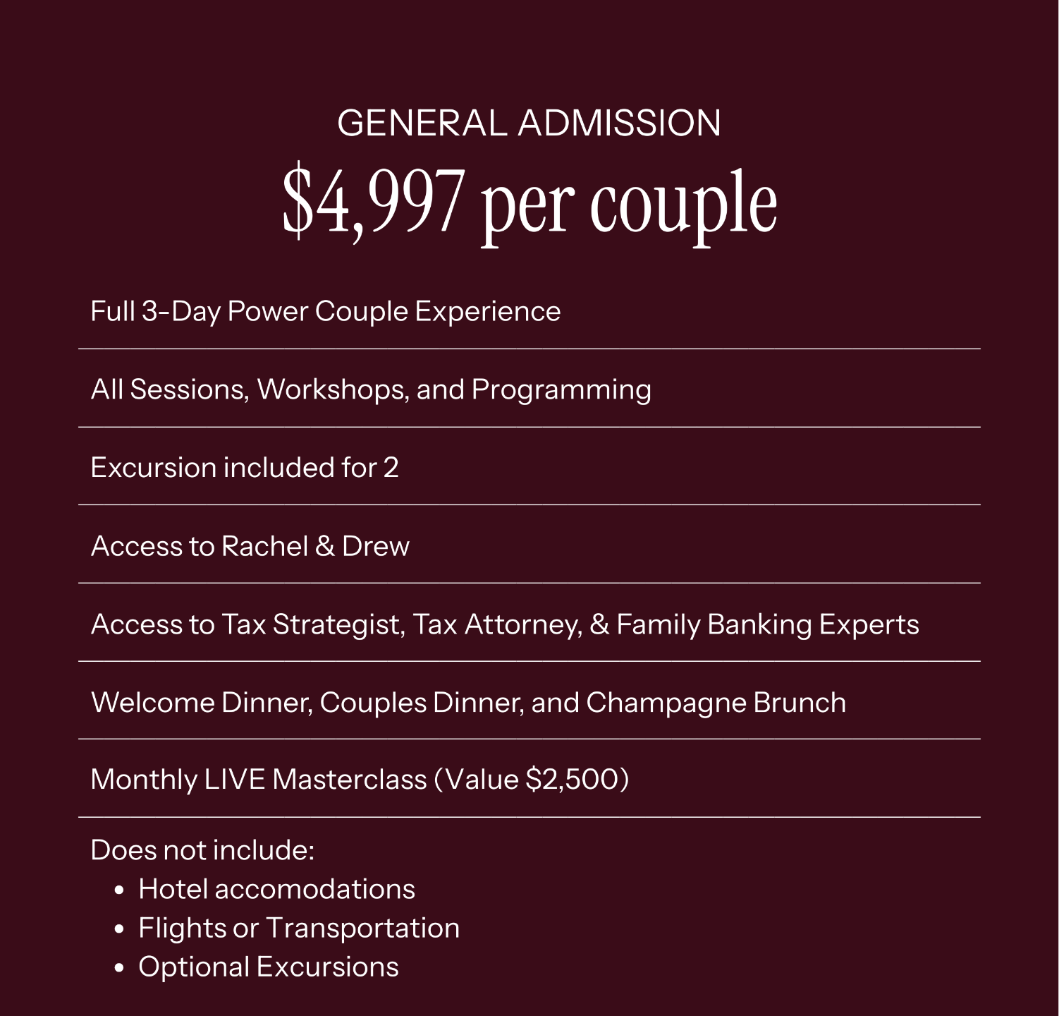The Power Couple Experience is a three-day, in-person immersion for entrepreneurial couples who are serious about building aligned wealth, intentional partnership, and a lasting legacy.