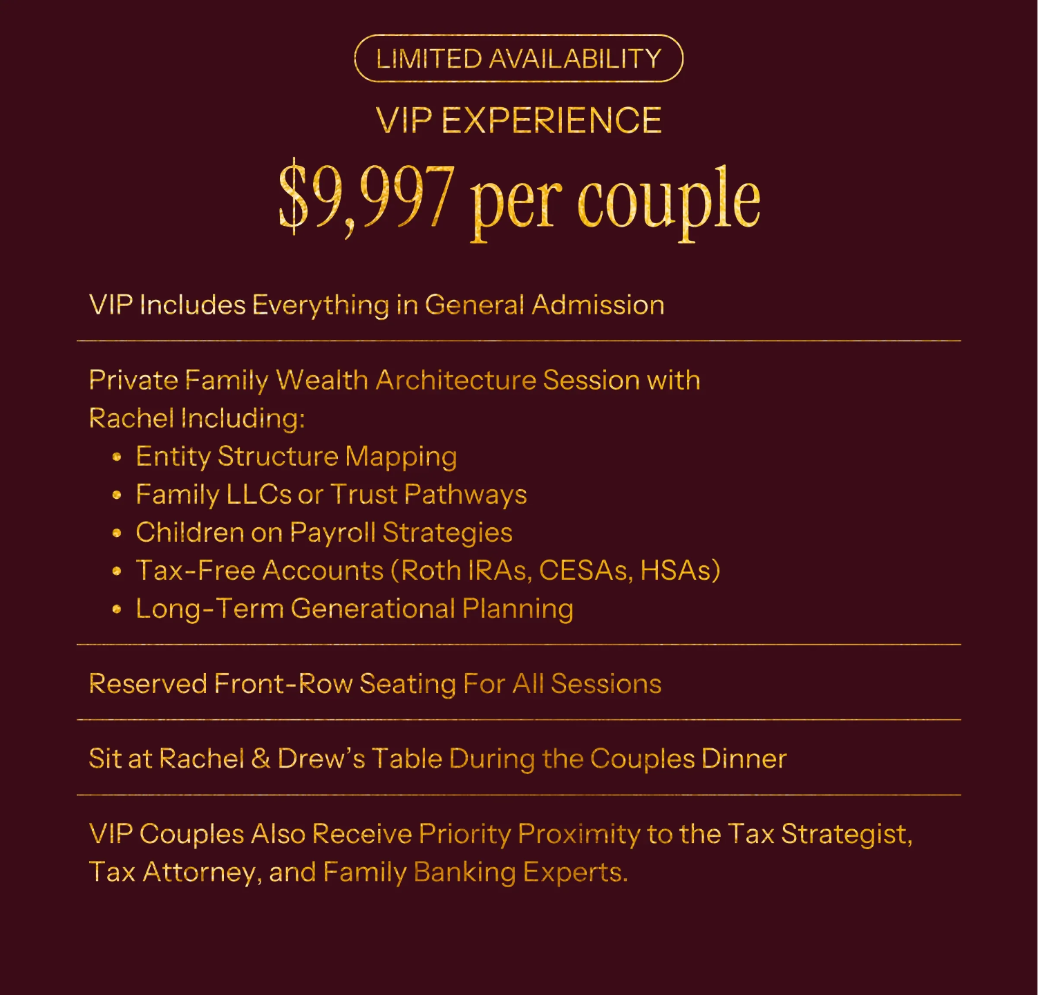 - A full day of tandem work covering wealth architecture, tax strategy, investing as a couple, and long-term vision.